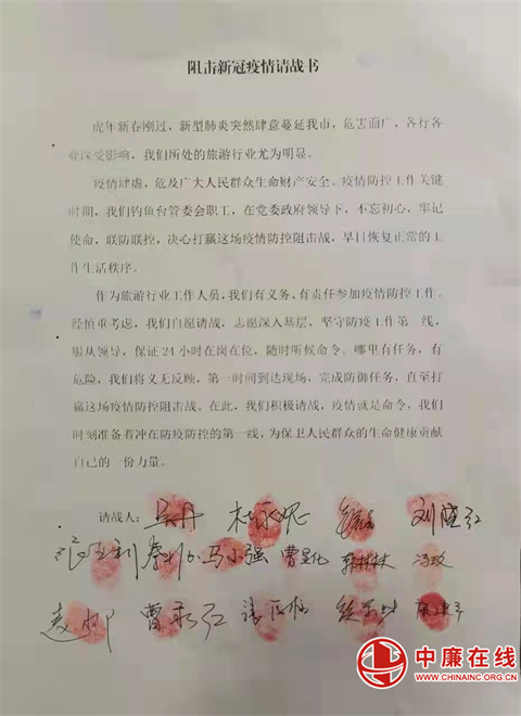 3月9日上午,钓鱼台景区管委会主任、天王镇党委书记张景波同志紧急召开干部职工大会,号召大家要舍小家为大家,立即关闭景区,主动参与到全区疫情防控战役中去。在他的号召下,15名党员、入党积极分子在《阻击新冠疫情请战书》签了名,摁上手印,一个个鲜红的手印如同不畏寒冬的梅花绚丽开放,真情表达了大家坚如磐石的决心、钢铁一般的斗志。请战书发出后,景区党支部第一时间成立了抗疫党员突击队和抗疫志愿者服务队。
