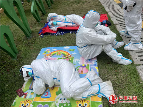 在紧张忙碌的间隙,奋战了近14个小时的工作人员终于可以休息一会,身穿防护服的他们有的坐在地上相互依靠着,有的躺在草坪上已然发出了鼾声,有的看着手里的泡面却没有热水而发着愁...小区的居民从窗外看着楼下这群可敬的“逆行者”们挨饿受冻十分不忍,递出了家中的睡垫、被子、食物和热水。“可爱的‘大白’,谢谢你们保护了我们大家!”一个稚嫩的声音从楼上传来,听到了这句暖人心脾的话语,看着那手里雪中送炭的物品,那一张张藏在口罩下那张憔悴的脸上都露出了欣慰的笑容。