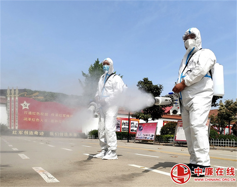 4月24日,线下学生复课前一天。山东省郯城县马头镇慈善爱心协会应急志愿者来到中国工农红军山东郯城罗荣桓红军小学和求实小学,助力线下学生复课忙消杀。