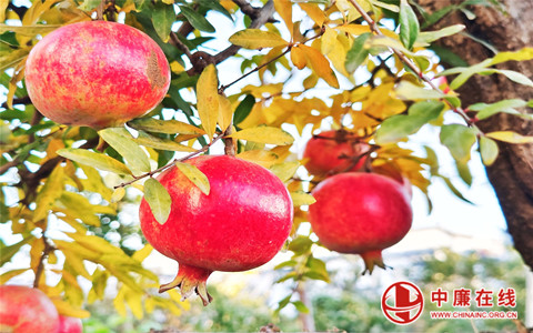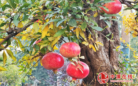 远处观望,老树桩石榴盆景古朴典雅,逢春结果,惹人喜爱。特别是那一个个硕大的大红袍石榴压弯了枝头,在泛黄树叶的映衬下搭配得更加合理,不仅格外引人注目,而且为院内的环境增添了美丽色彩。(高军 摄影)