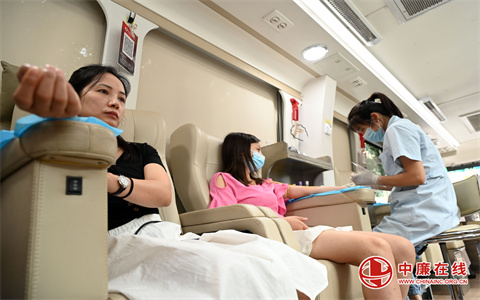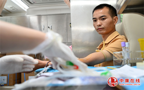 6月30日,四川省内江市东兴区委综合大楼,党员、干部在献血车上无偿献血。