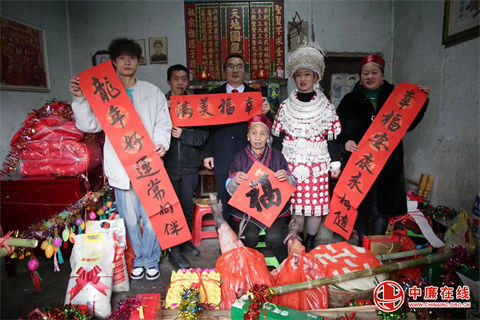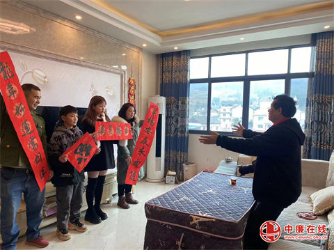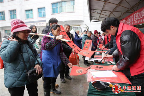 小组由市文联副主席文仁刚带队,在场坝组,正逢一村民办喜事, 16人小组中的书法爱好者现场挥毫泼墨,为群众书写春联、送福字,群众闻声积极前来免费领取春联、“福”字,党员、青年志愿者热情地为群众开展志愿服务,现场洋溢着喜气与热闹。