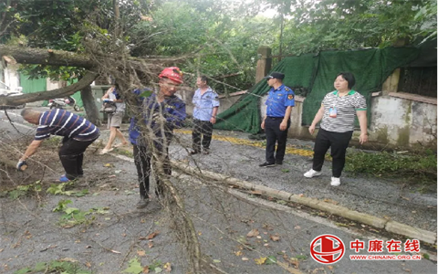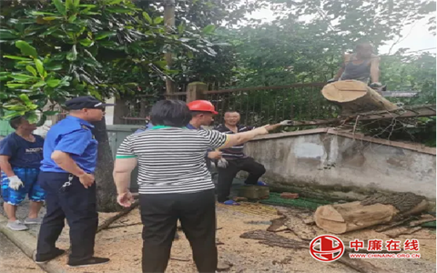 事故现场,坍塌的大树横在马路中央,粗壮的树干压倒了围墙和防护栏,满地都是断枝落叶,现在一片狼藉。为避免发生危险,潘兰仙马上对来往车辆进行疏导,并组织工作人员拉起警戒线,她联系的林业部门也第一时间赶到现场,与潘兰仙共同商定树木清除计划,在做好安全防护和现场警戒后,专业施工人员使用枝剪、油锯等专业装备对倒塌树木进行处理。