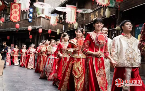 却扇展颜,交拜行礼,合卺而酳,解缨结发,携手盟誓……一项项中式传统婚礼的仪式蕴含着深厚的文化内涵和民俗传统,用中国人最古老又不失浪漫的方式寄托了对新人的美好祝福。18对来自不同行业、年龄层及文化背景的新人们缓缓走过红毯,他们脸上洋溢着幸福的笑容,现场群众也感受到这喜庆的氛围纷纷拿出手机记录下这美好的一刻。