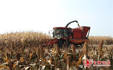 金黄的玉米地里,收割机轰隆作响,穿梭作业,一排排玉米植株连杆带棒被卷入机械中,摘棒、剥壳、秸秆粉碎一气呵成。卡车拉装粉碎后的秸秆,农用车则拉装剥了壳的玉米。以往耗时几天的工作量,如今不到10分钟的时间便完成了。机械收割的工作效率可见一斑。