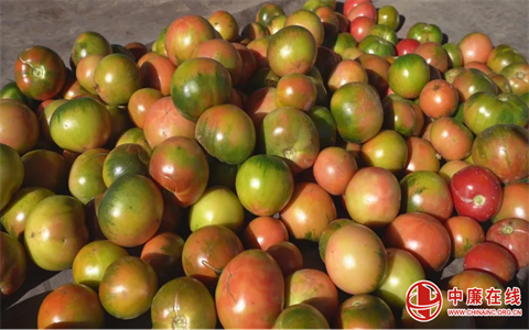 大棚里一片生机盎然的景象。绿油油的叶子中间,红彤彤的西红柿点缀其中,藤蔓上一个个西红柿个大饱满、色泽艳丽,看起来煞是喜人。工人们正有条不紊地把采摘好的西红柿采摘、分拣、装箱,呈现出一幅热闹非凡的丰收景象。