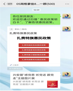 线上宣传,实时互动促交流。利用网格化居民微信群、朋友圈等方式,发送惠民政策链接、《惠民政策明白卡二维码》,鼓励引导群众通过扫码了解相关惠民政策,扩大政策宣传范围。
