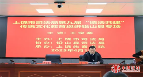 为了进一步增强社区矫正对象社会家庭责任感,大力弘扬中华民族传统文化美德,促进广大社区矫正对象树立正确的价值观念,更加顺利融入社会。4月1日,江西省上饶市司法局第九届“德法共建”传统文化教育巡讲铅山县专场在铅山县司法局指挥中心举行,巡讲由县司法局副局长吴伟主持,上饶市社区矫正管理局周国荣局长亲临指导。