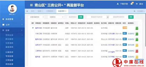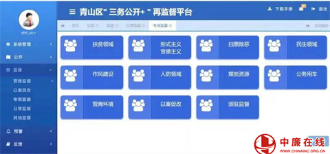 青山区纪委监委建成集“公开、监督、预警、反馈、分析”五大功能于一体的“三务公开+”再监督平台,由单纯的“线下”监督变为“线上+线下”同步监督。今年以来,根据工作发展需要,平台增设“优化营商环境”和“以案促改”模块,进一步拓宽了监督范围。
