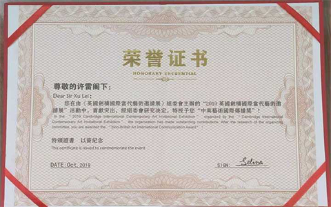 被英国剑桥国际当代艺术组委会授予“中英艺术国际传播奖”证书