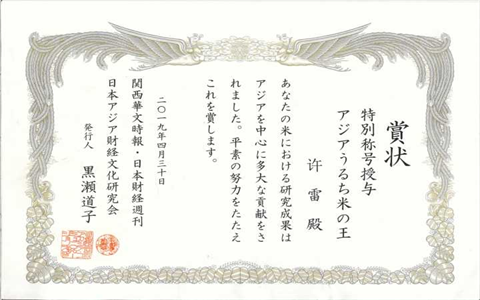 被日本关西华文时报、日本财经週刊、日本财经文化研究会联合授予“亚洲粳米之王”称号